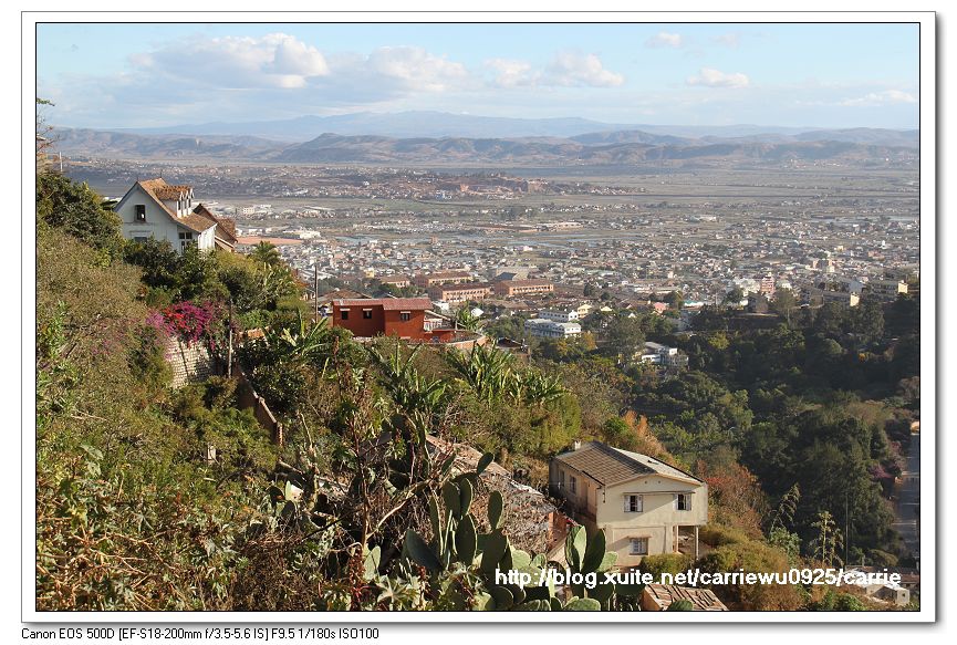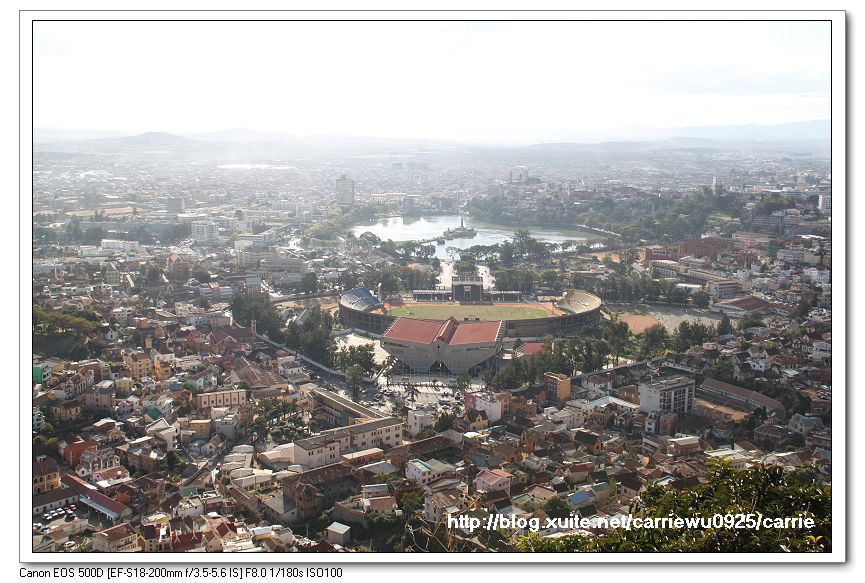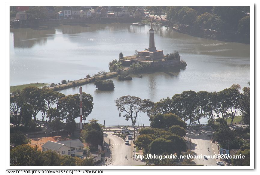 俯瞰安塔那那利佛Antananarivo,這個城市真的很美,道路和建築都依著地形高低起伏著,能夠欣賞到蓋在山腰上的美麗洋房,以及2個湖泊,其中有勝利天使矗立在湖中央的,就是我們所住五星級飯店Calton前面的湖喔!
