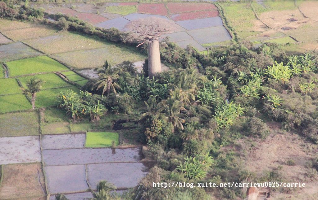 接近穆隆達瓦Morondava就可以從空中看見超大棵的猴麵包樹Baobab!鳥瞰西部土地呈現一片紅褐貧瘠,馬達加斯加的自然環境被人類破壞得很嚴重,在人類到這裡之後的2千年裡,95℅的雨林被砍伐,導致土壤侵蝕流失,動物棲地變成光禿禿一片,動物當然也就瀕危滅絕,真的很令人難過!
