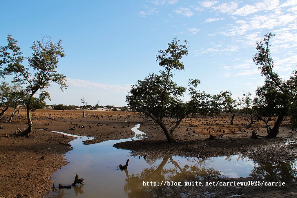 車子愈開四周景致愈荒僻,路旁出現幾家賣店的形式就更原始了。天空好藍,通往Kimony海灘的紅土道路塵土飛揚。越接近海邊,樹木植物呈現很特殊的生長方式,原來這裡有紅樹林,當雨季來臨時,這一大片都是被水淹沒的,現在是乾季,土壤上依稀看得出水淹過的痕跡。