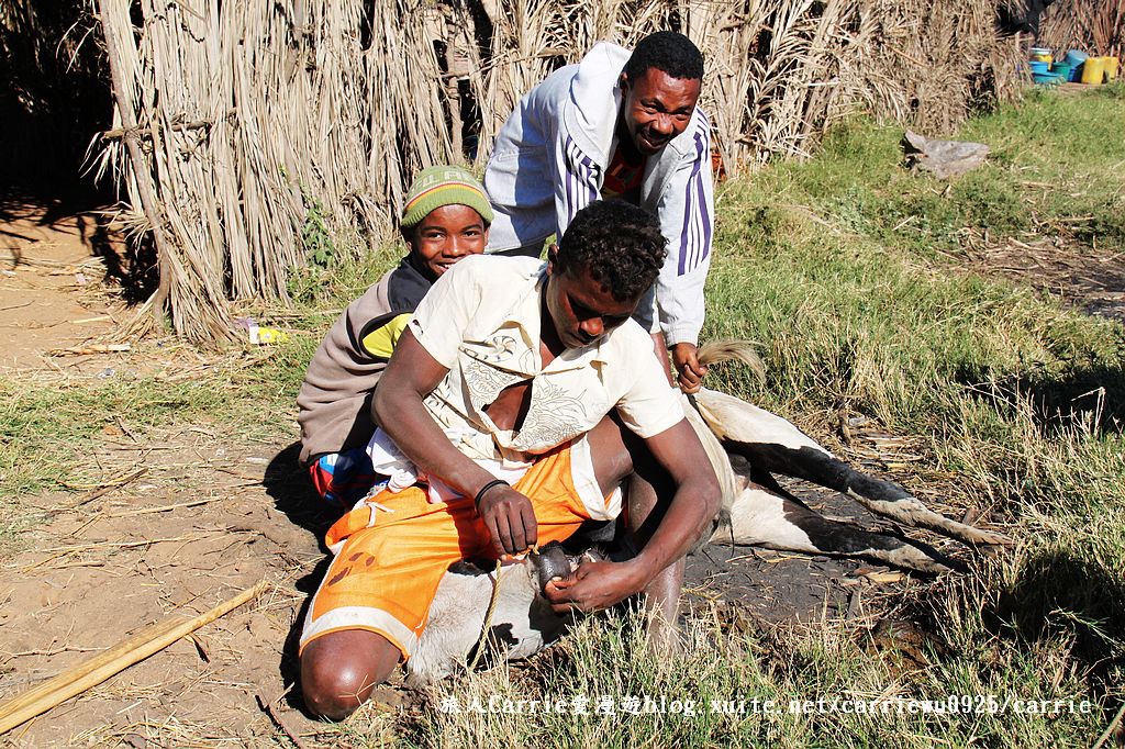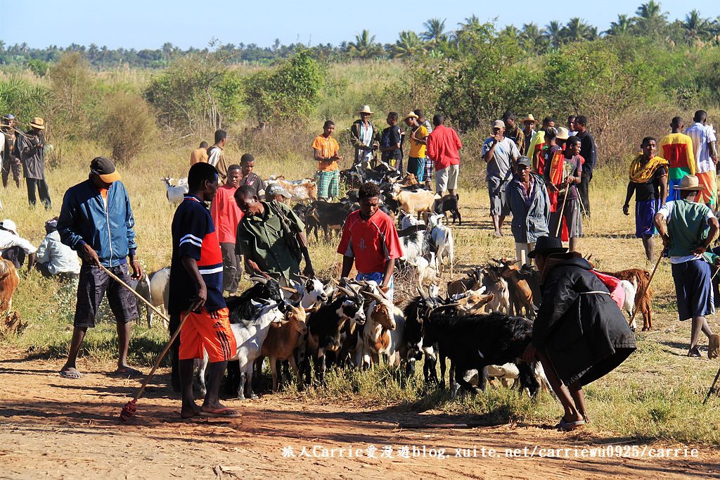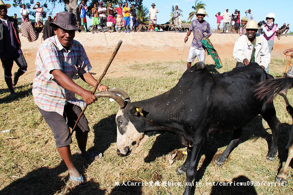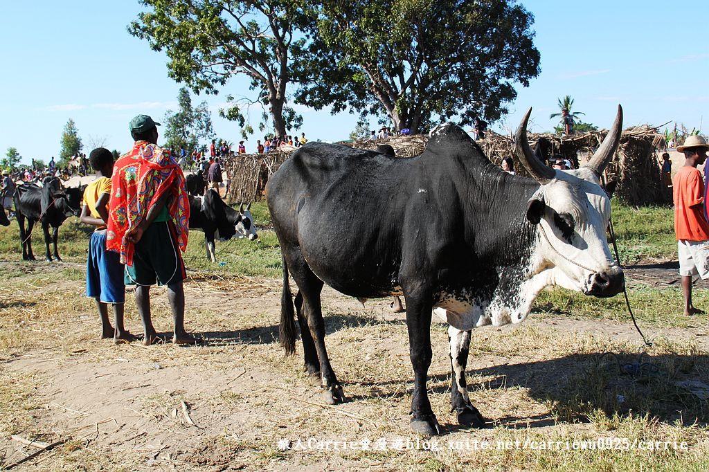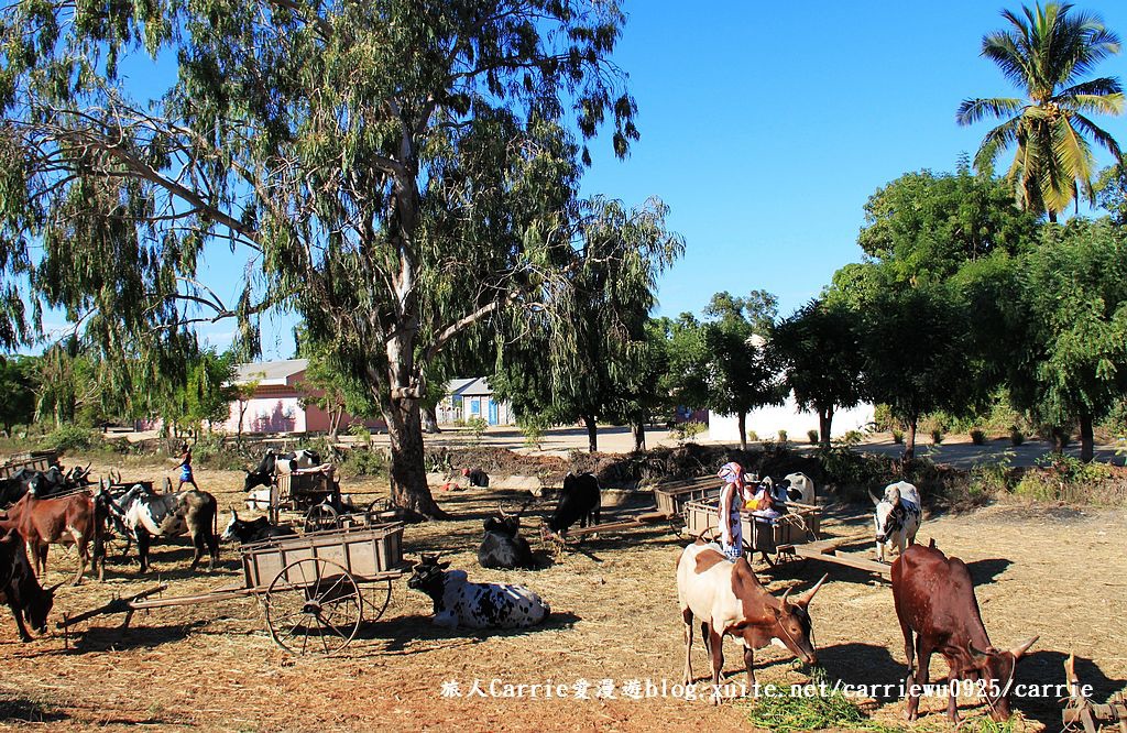 在東非外海,馬達加斯加Madagascar,穆隆達瓦Morondava的公路旁邊,Carrie欣賞到令人嘖嘖稱奇的傳統牲畜市場,藍色晴空,大片樹蔭,遼闊無邊的紅黃土地,各式牛車悠哉地任意停放,牛隻四散吃草。