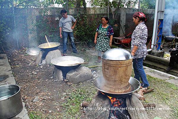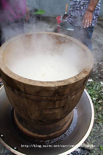 又回到中央廚房區,同時有三個鍋爐在煮,蠻壯觀的,其中一個臼型的大木桶,煮的是香噴噴的白米飯,一掀開蓋子,蒸氣直冒出來,還可以看到飯的表面上有好幾個氣孔。