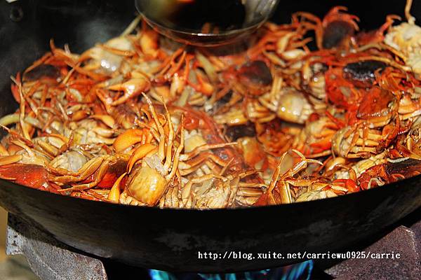 嘩!武陵的溪裡面居然捕得到溪蟹耶!大火熱炒的溪蟹,一隻隻紅通通的,加點油加點醋,最後以九層塔爆香,溪蟹雖然肉不多,但有很濃郁的鮮滋味。